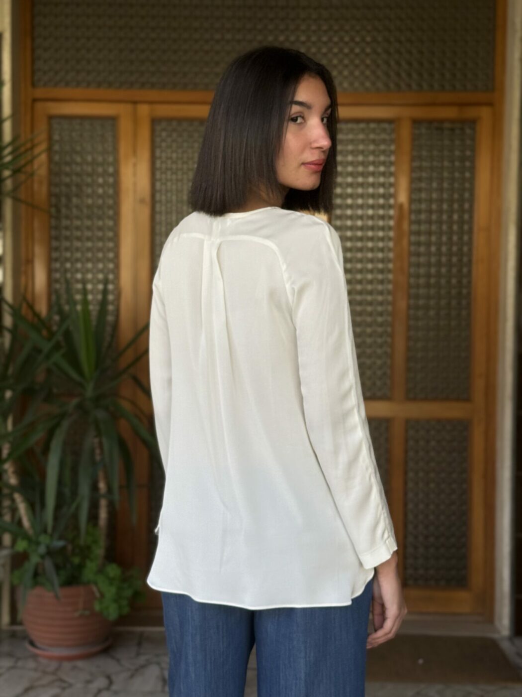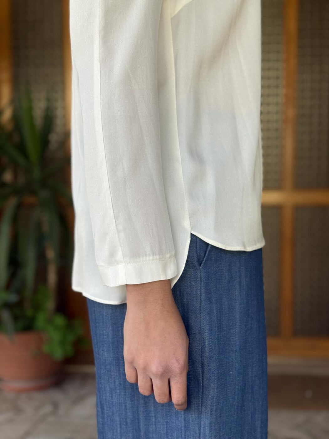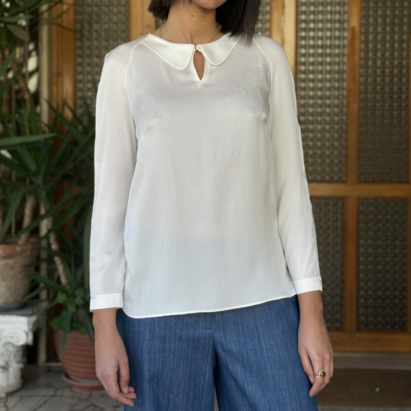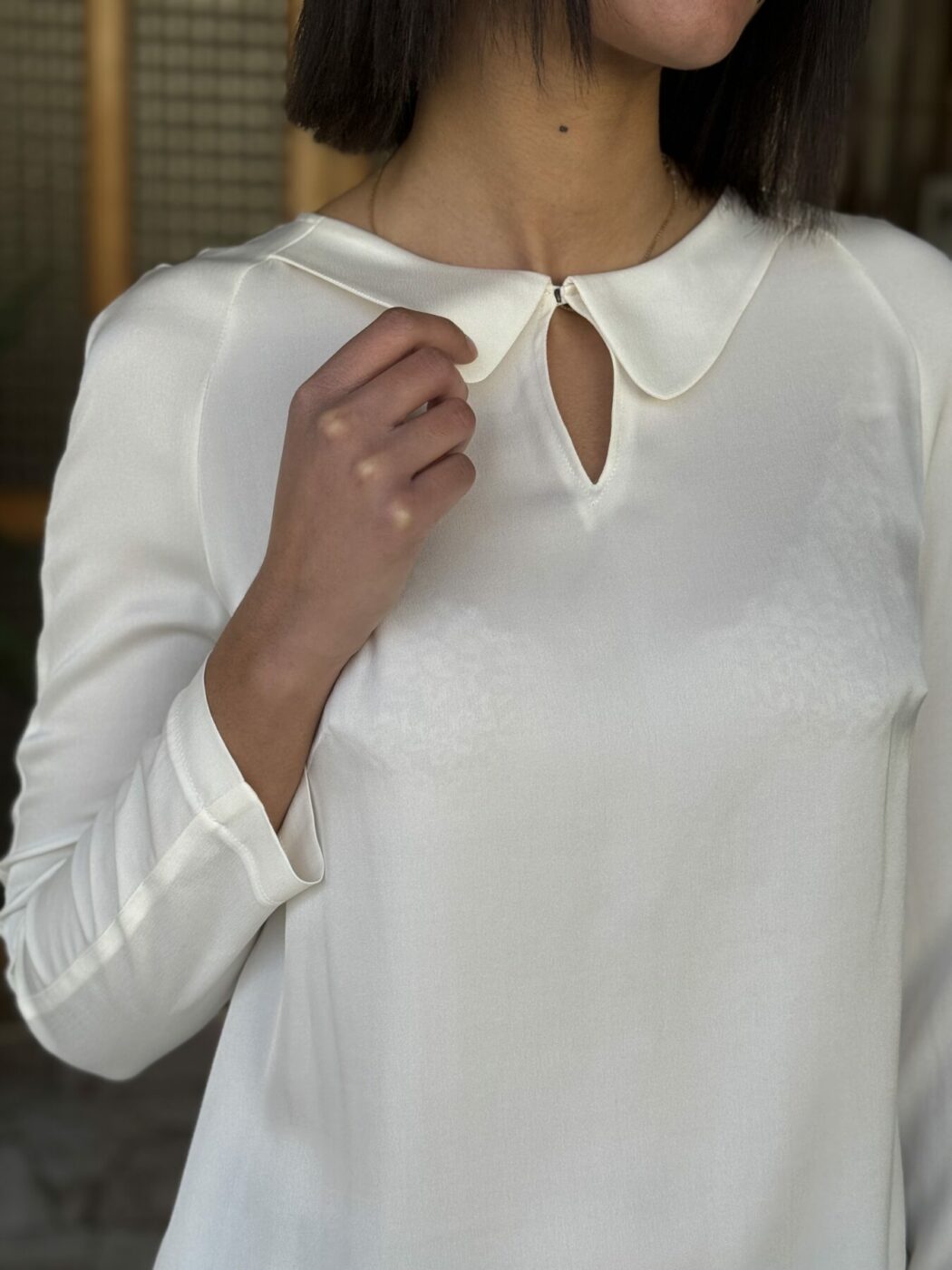Finto colletto applicato su giro collo tondo con una particolare apertura a goccia sul centro davanti, chiusa da un bottoncino all’interno.
