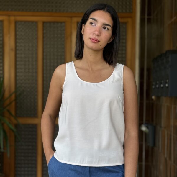 Pensata per essere indossata sia chiusa con i bottoni da sola oppure sganciata con sotto il suo top in abbinamento cromatico.