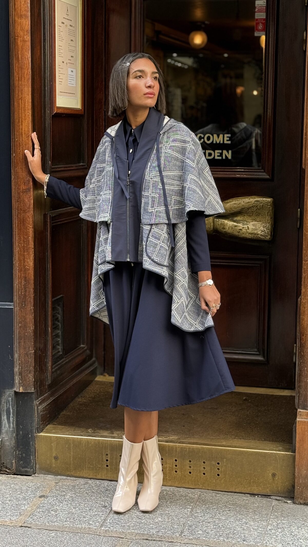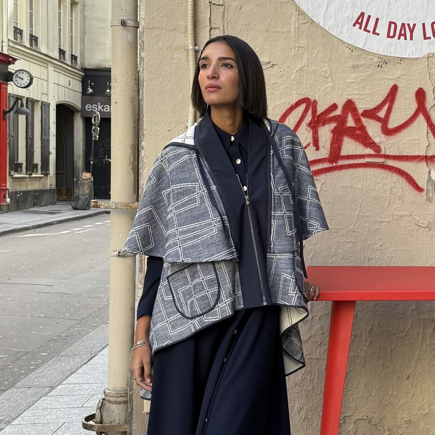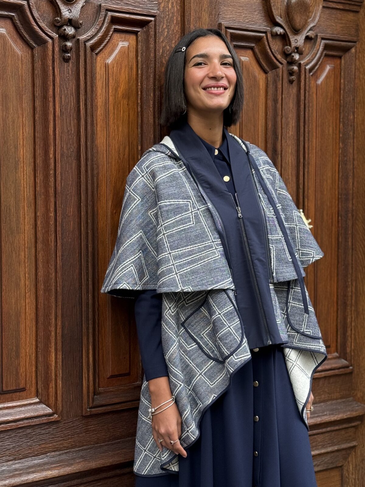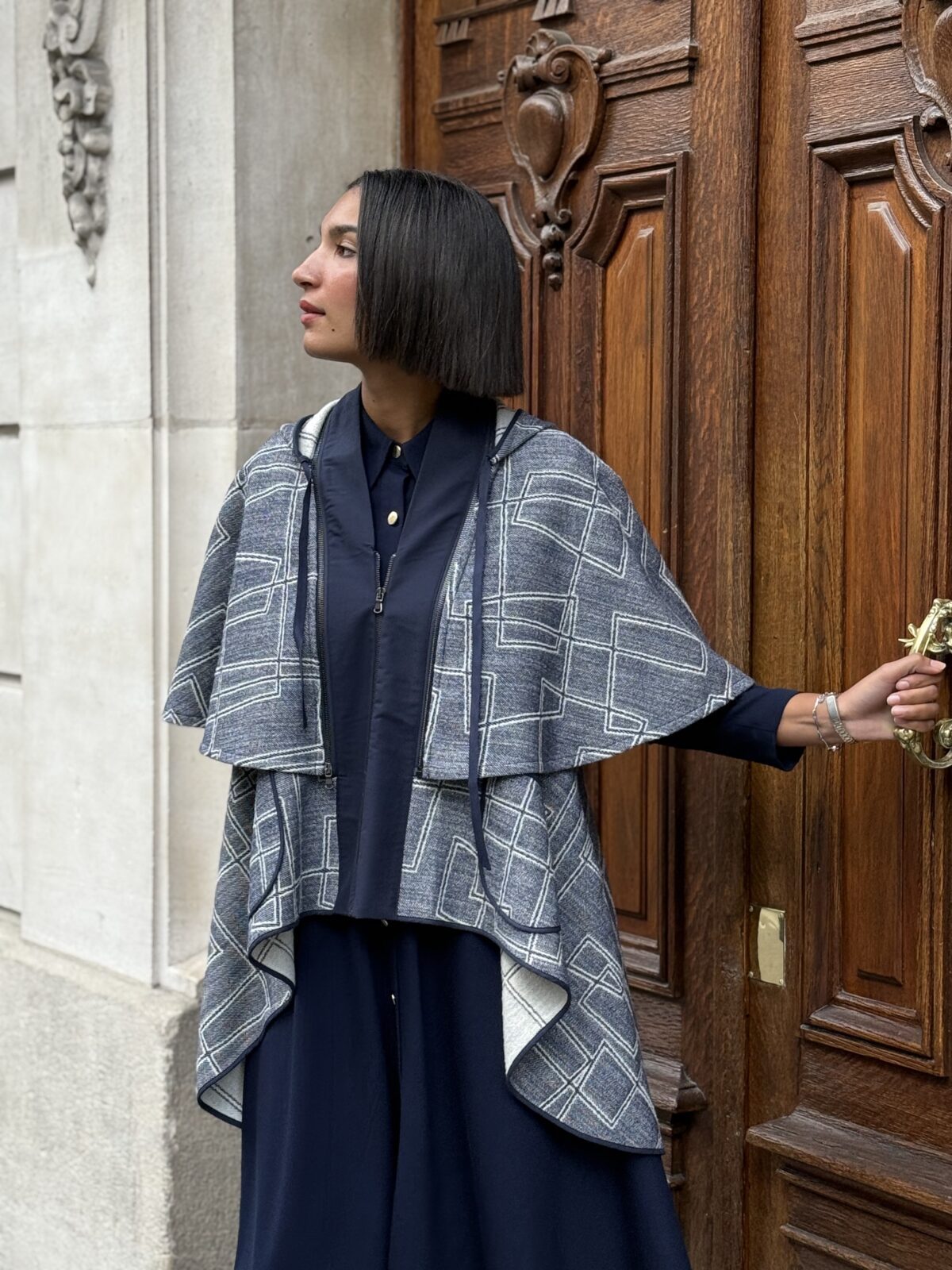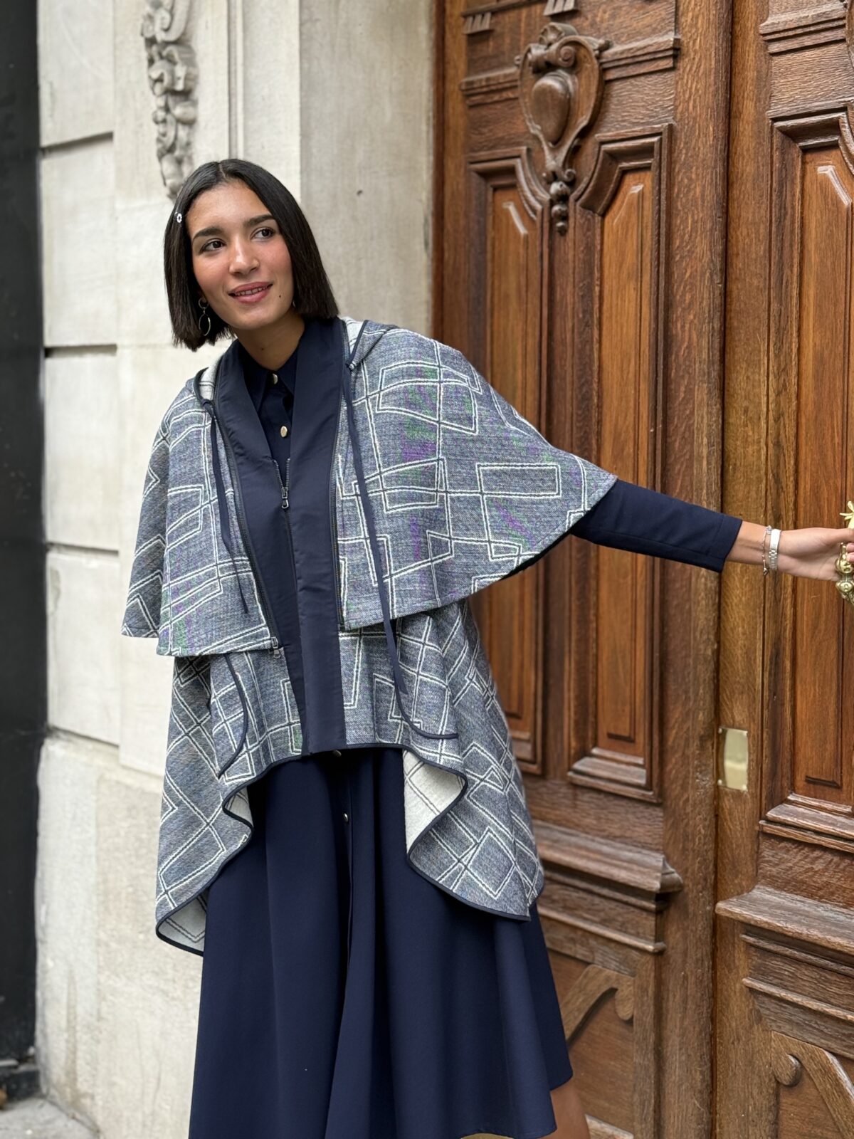 La novità di questo capo è senza dubbio la parte superiore, una cappa con cappuccio interamente staccabile tramite una zip cucita sul bordo di cotone.