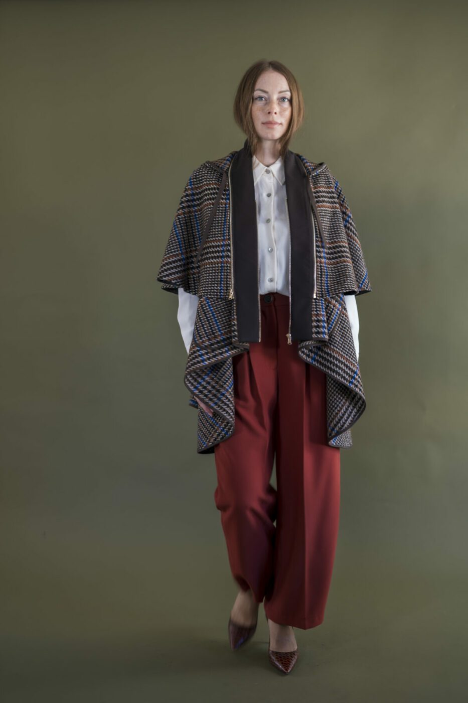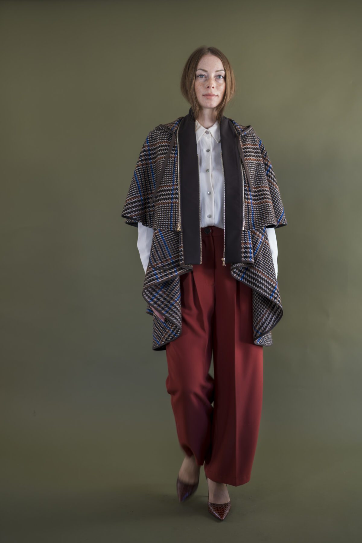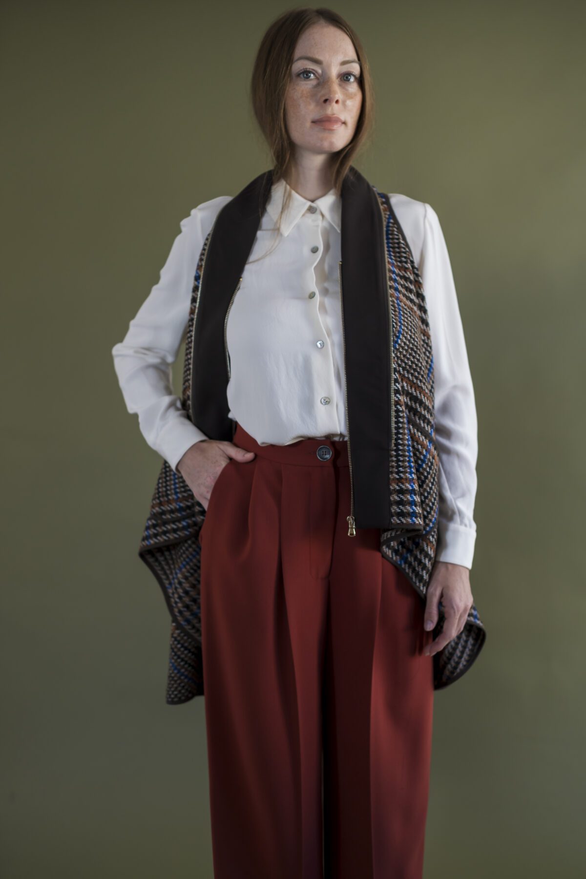 Chiusura davanti con zip e bottone, tasche sul fianco.