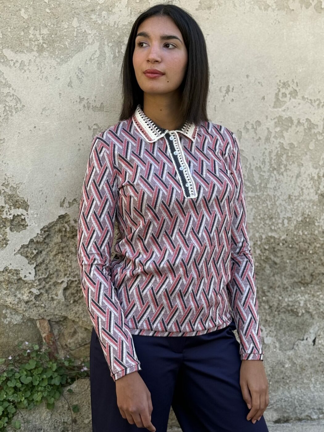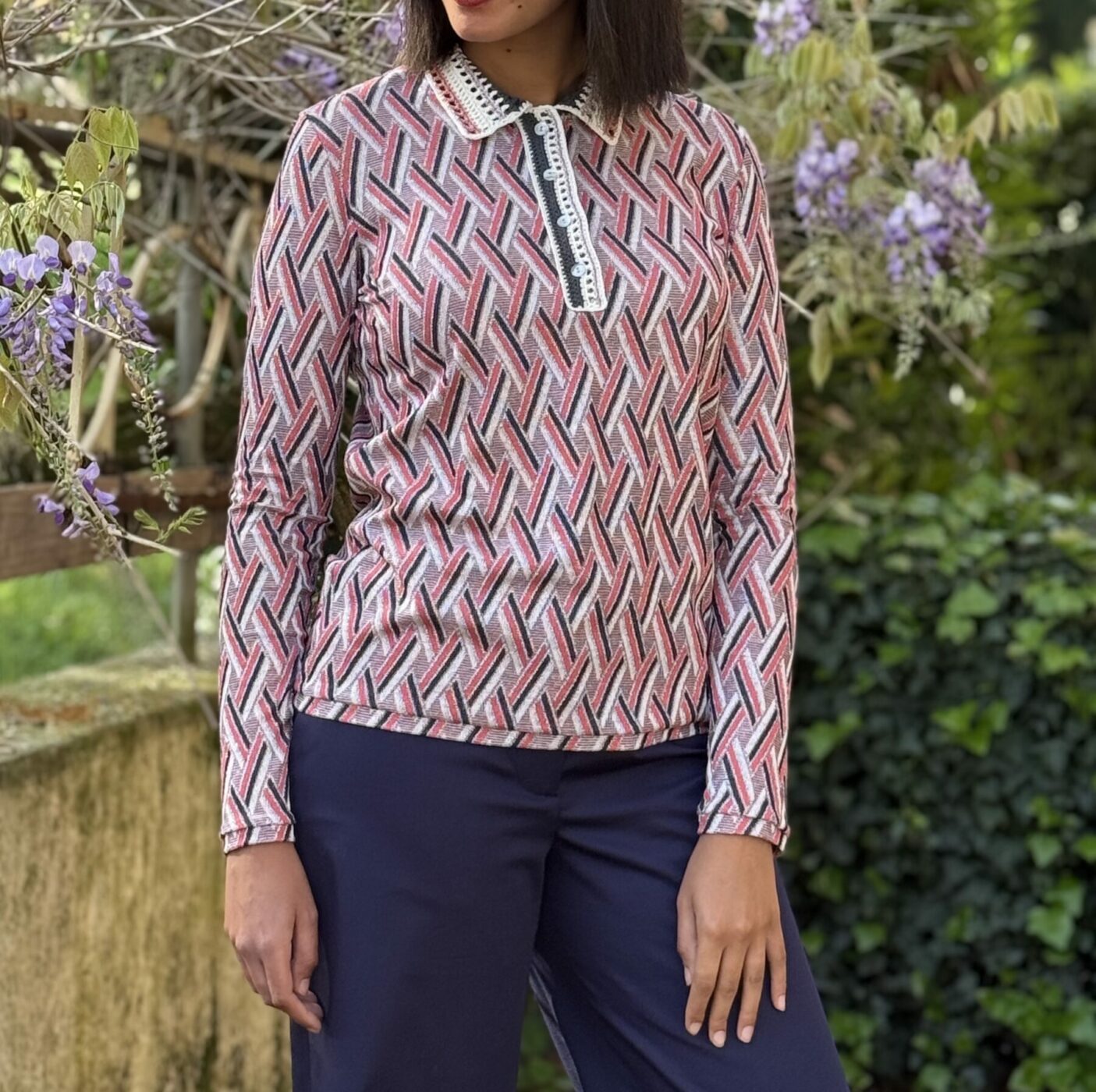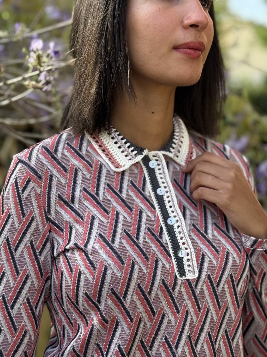Scollo polo con apertura a bottoni rifinita da colletto realizzato ad uncinetto.