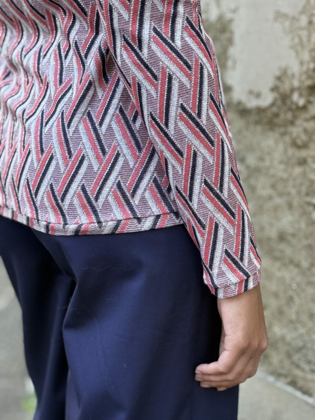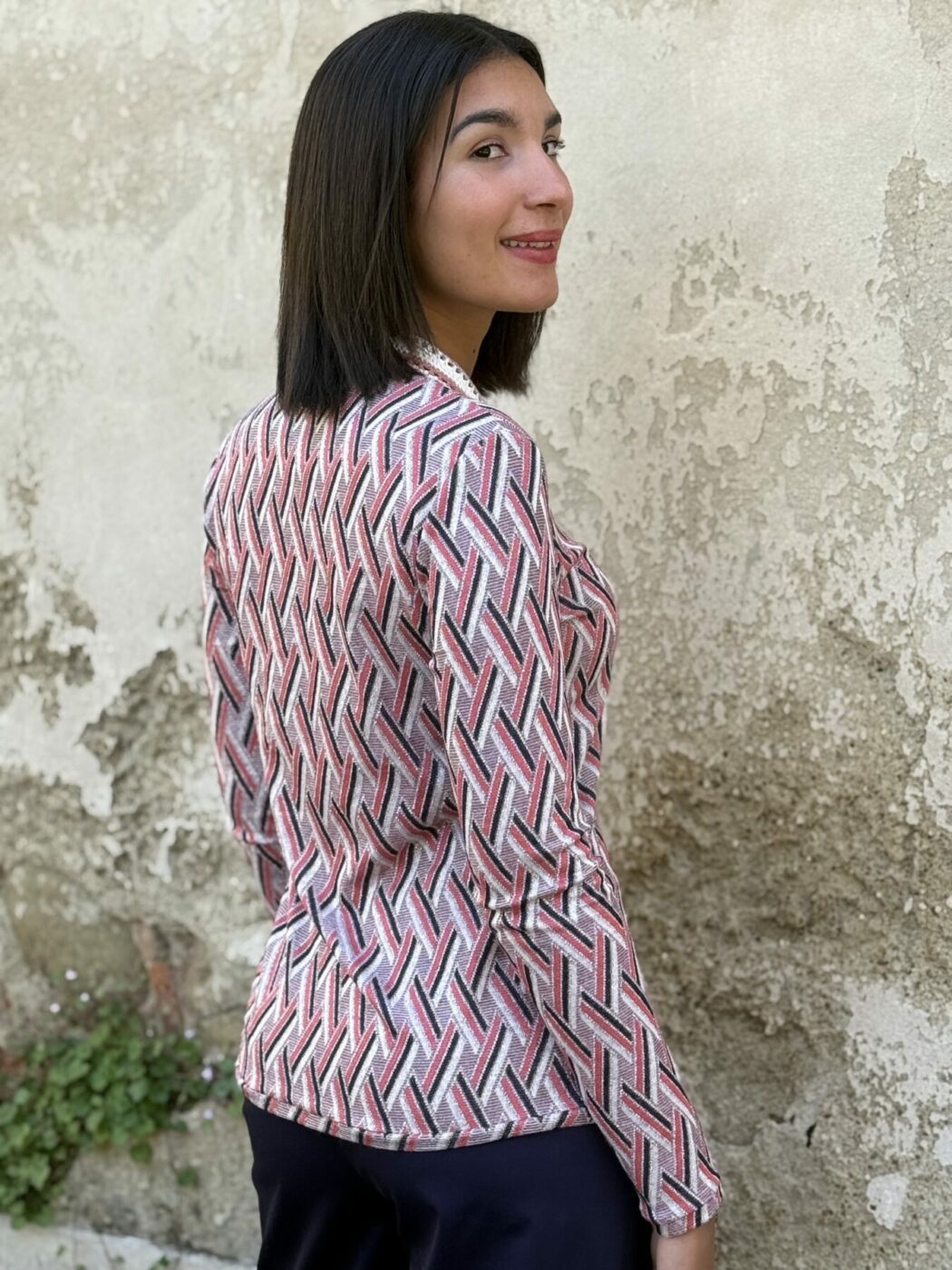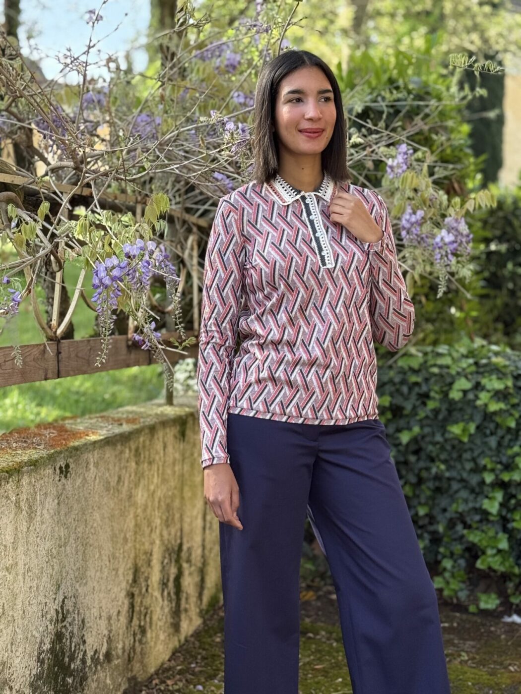 Sotto giacca fantasia rosa e blu notte con colletto uncinetto